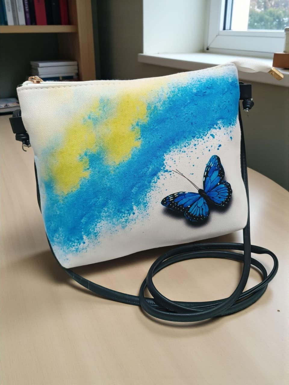 An adjustable slim crossbody strap is included for hands-free carrying.